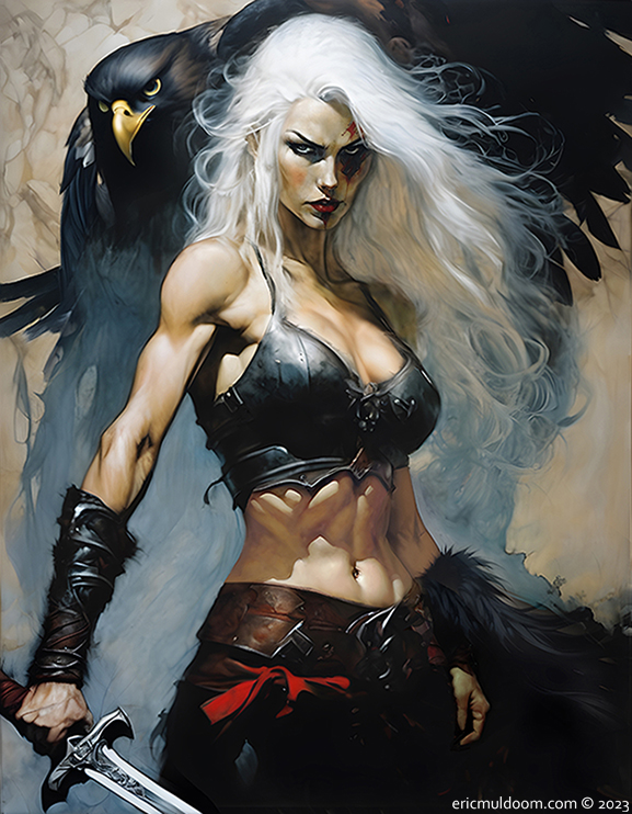 Drifa is a renegade swords-woman and a guard, once a member of the Order of the Wayfarers, who accompanied the caravans between the city of Mhíl and Cecht. Nowadays she is sometimes seen in the company of the Black Men, but mostly she wanders the Thitorn Mountains alone. Her famed companion is the White Eagle, Fuwak, a magical creature that can take on a form so huge it is larger than two full-grown men.